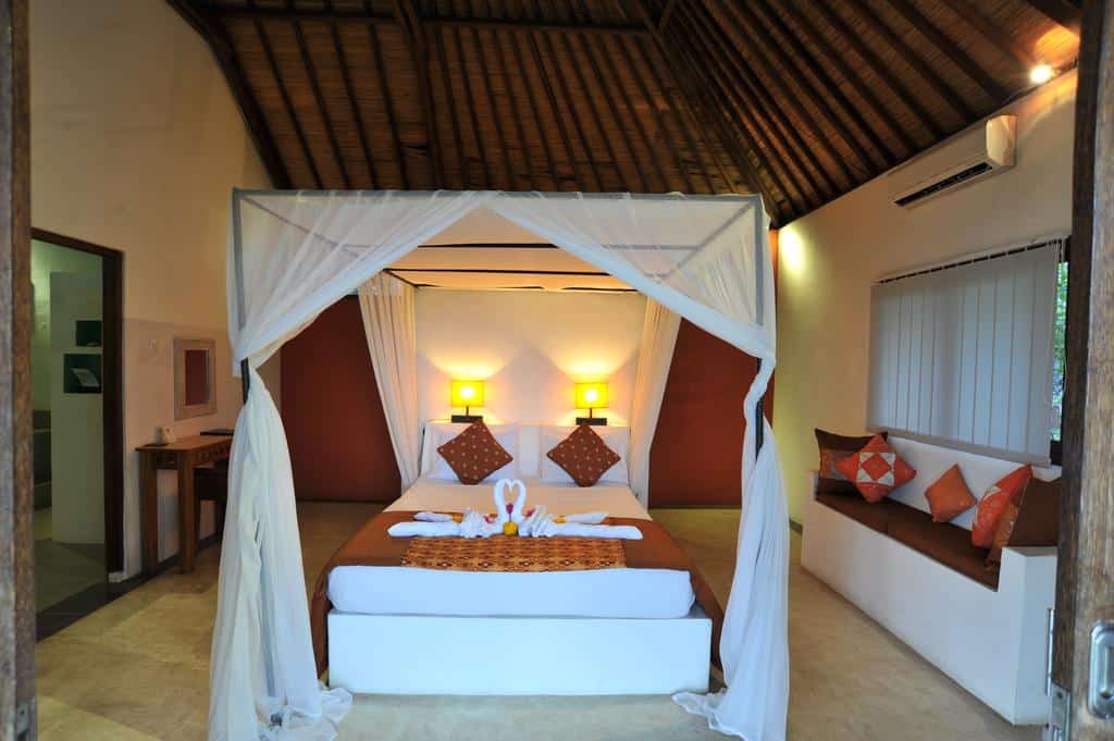 L’Anda Amed Resort se situe dans la région d’Amed à Bali. Niché sur les collines il dispose de villas privées avec jardin qui offrent toute une vue imprenable sur la mer. Vous pourrez profiter d’une connexion Wi-Fi gratuite dans tout le complexe et d’un parking privé gratuit également.Toutes les villas disposent d’une véranda et d’une terrasse sur jardin privé où sont installés une banquette-lit et un coin-repas. Les chambres sont climatisées et fournies d’une télévision à écran plat, d’un minibar, d’une bouilloire et d’un coffre-fort. La salle de bains privative offre eau froide et eau chaude et dispose d’une baignoire et d’une douche.Depuis l’Anda Amed Resort vous pourrez rejoindre l’aéroport international Ngurah Rai en 2 heures. Vous mettrez 1 heure en voiture pour atteindre le village d’Aga.Le spa et le centre de bien-être de l’établissement vous proposeront massages et soins. Le resort met aussi à votre disposition un service de blanchisserie. Le restaurant du complexe offre une jolie vue sur l’océan et se situe juste à côté de la piscine à débordement. Il vous servira des plats locaux et des spécialités internationales tous les jours de 7h à 23h.