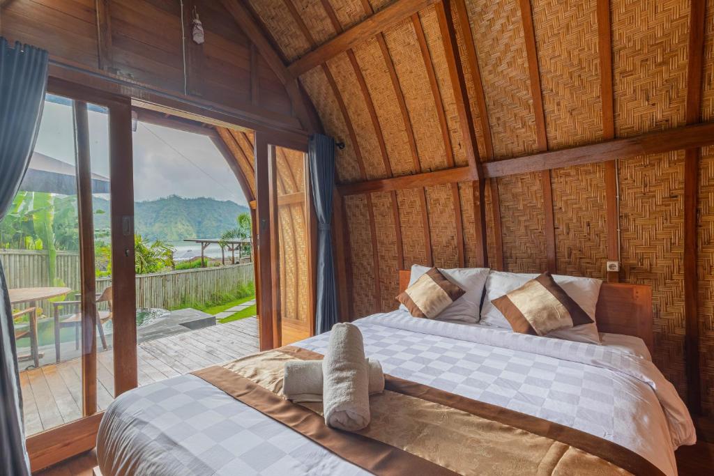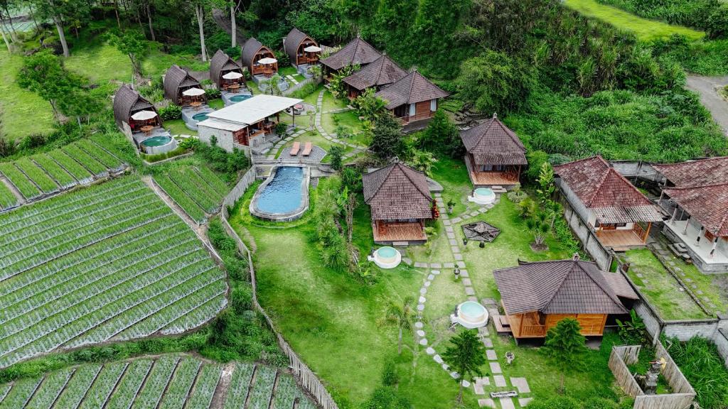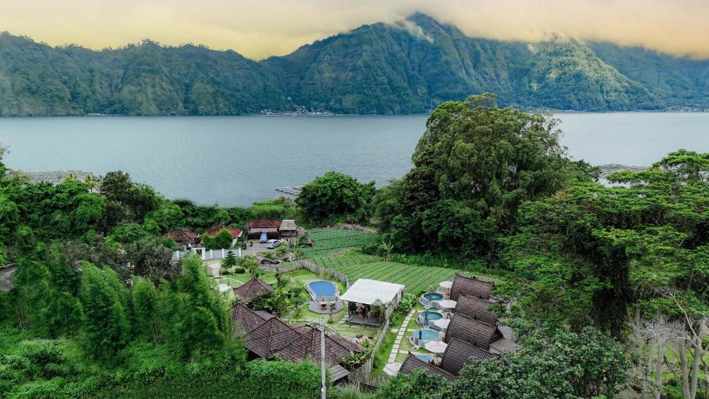 Le resort propose une trentaine de villas et bungalows spacieux disséminés dans des jardins tropicaux en terrasses, menant vers la vue panoramique. Les hébergements (env. 50–70 m²) offrent une décoration balinaise chaleureuse avec bois naturels, pierre sculptée et matériaux locaux. Toutes les unités disposent de climatisation, lit king‑size ou twin confortable, salle de bain spacieuse (baignoire et/ou douche semi‑ouverte), grand balcon ou terrasse donnant sur le lac, volcan et vallées, TV écran plat, minibar, Wi‑Fi gratuit, coffre‑fort, peignoirs et plateau thé/café. Certaines villas disposent de piscine privée ou jacuzzi surplombant le panorama. Les voyageurs apprécient l’espace généreux, la décoration authentique, la propreté et surtout les vues spectaculaires, bien que certains avis mentionnent quelques détails d’entretien mineurs selon les catégories.