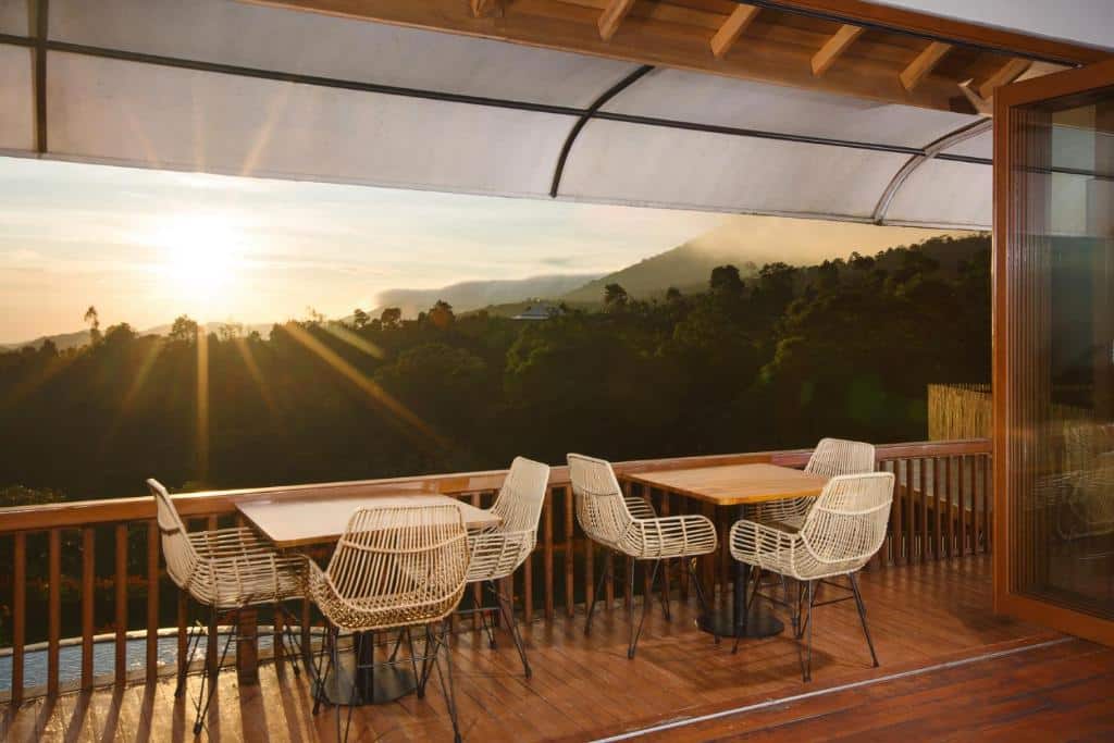 L’établissement est composé de chambres et de villas en bois au style chaleureux, souvent organisées en terrasses avec vue directe sur la vallée et la jungle. Les hébergements disposent en général d’un balcon ou d’une terrasse, d’une literie confortable, d’une salle de bain moderne, du Wi-Fi, d’un plateau thé/café et parfois de services supplémentaires comme Netflix ou un coin salon. L’ambiance est cosy, avec une décoration soignée qui s’intègre bien au paysage de montagne.