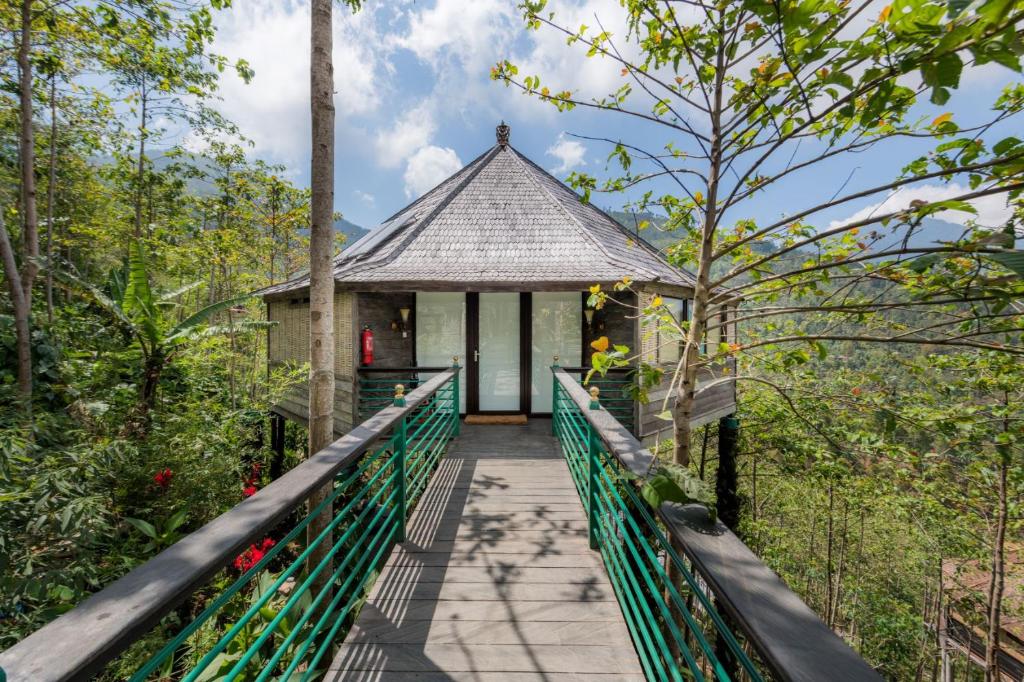 Le domaine propose deux grands types d’hébergements : les Floating Villas, construites sur pilotis au-dessus de la pente, et les Forest Cabins, nichées plus bas dans la végétation. Les Floating Villas (environ 100 m²) sont dominées par le bois et les baies vitrées : elles offrent un vaste balcon, un jacuzzi privé avec vue jungle, une mezzanine avec lit supplémentaire, un coin salon, kitchenette, machine à café, minibar, climatisation, chauffage d’appoint et enceinte audio. Les Forest Cabins, plus compactes, proposent un lit king-size, salle de bain privative, minibar, chauffage et vue directe sur la forêt, avec une ambiance cabane chic en pleine nature.