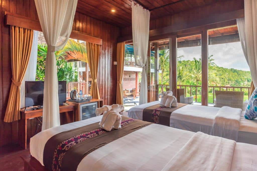 Cette petite adresse 3★ propose des chambres doubles et familiales, certaines avec terrasse ou balcon donnant sur les rizières ou le jardin. Les chambres sont de confort simple mais cosy : lit double ou twin, salle de bain privée avec eau chaude, plateau thé/café, parfois minibar, et Wi-Fi. Plusieurs avis soulignent la très belle vue depuis la chambre et la piscine comme principal atout du lieu.