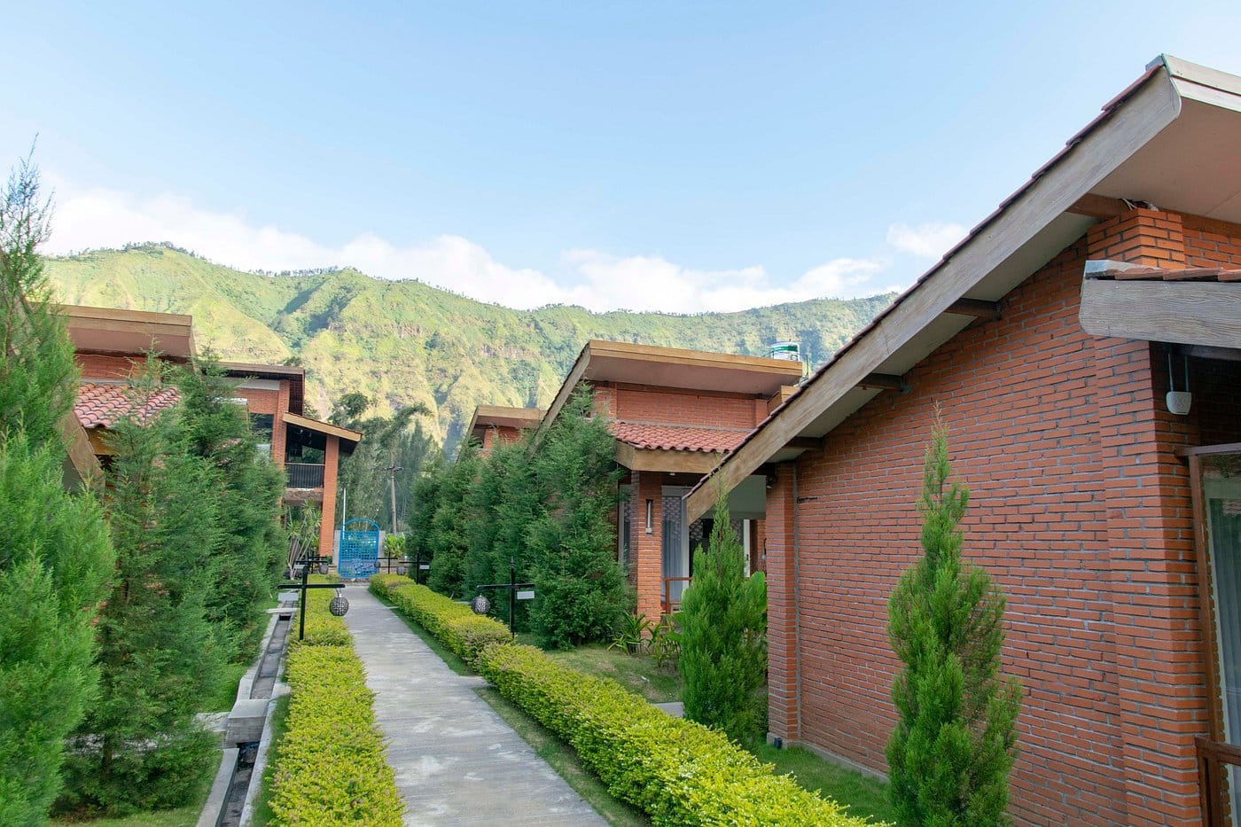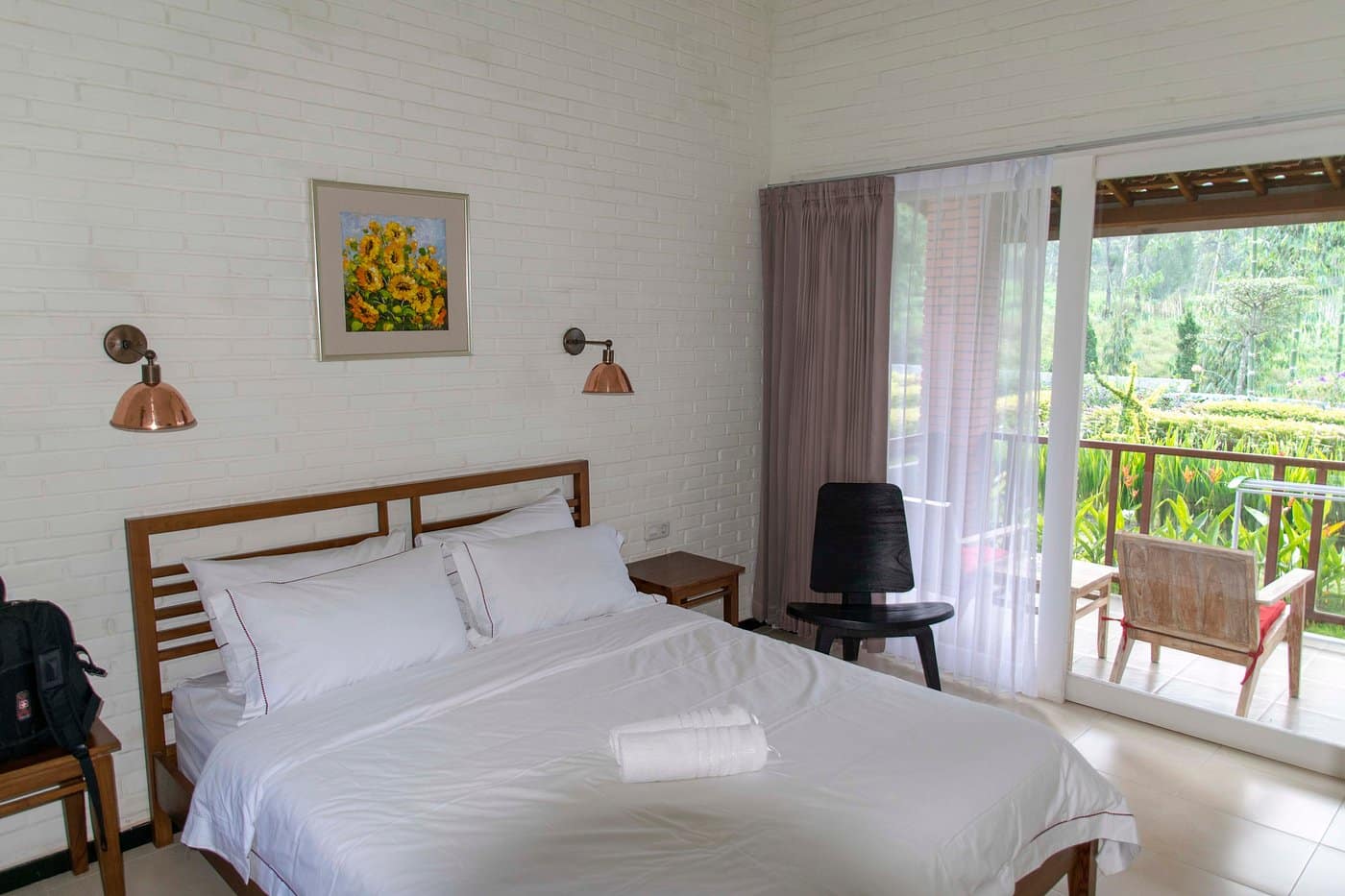 L’hôtel propose des bungalows semi-individuels, spacieux et bien entretenus, avec terrasse privée donnant sur les jardins ou les collines. Les chambres disposent d’un lit confortable, salle de bain privée avec eau chaude fiable, TV écran plat, Wi-Fi gratuit et une décoration minimaliste moderne en brique blanche. Pas besoin de climatisation grâce à la fraîcheur ambiante, mais les soirées fraîches nécessitent souvent un pull.